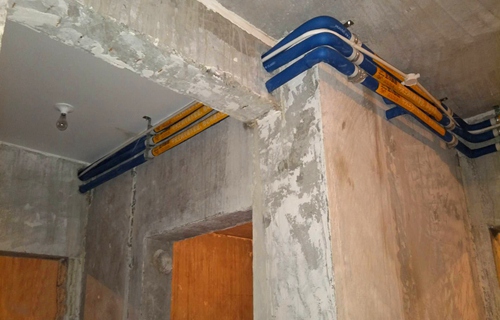 3.是高位打孔的安裝:注意看管道布局,同樣很下邊那根管道是空調冷凝水的排水管,這種坡度很小是因為產品有內置水泵哦。再看打孔位置,孔洞很好的避開了主鋼筋,也沒有壓低層高。